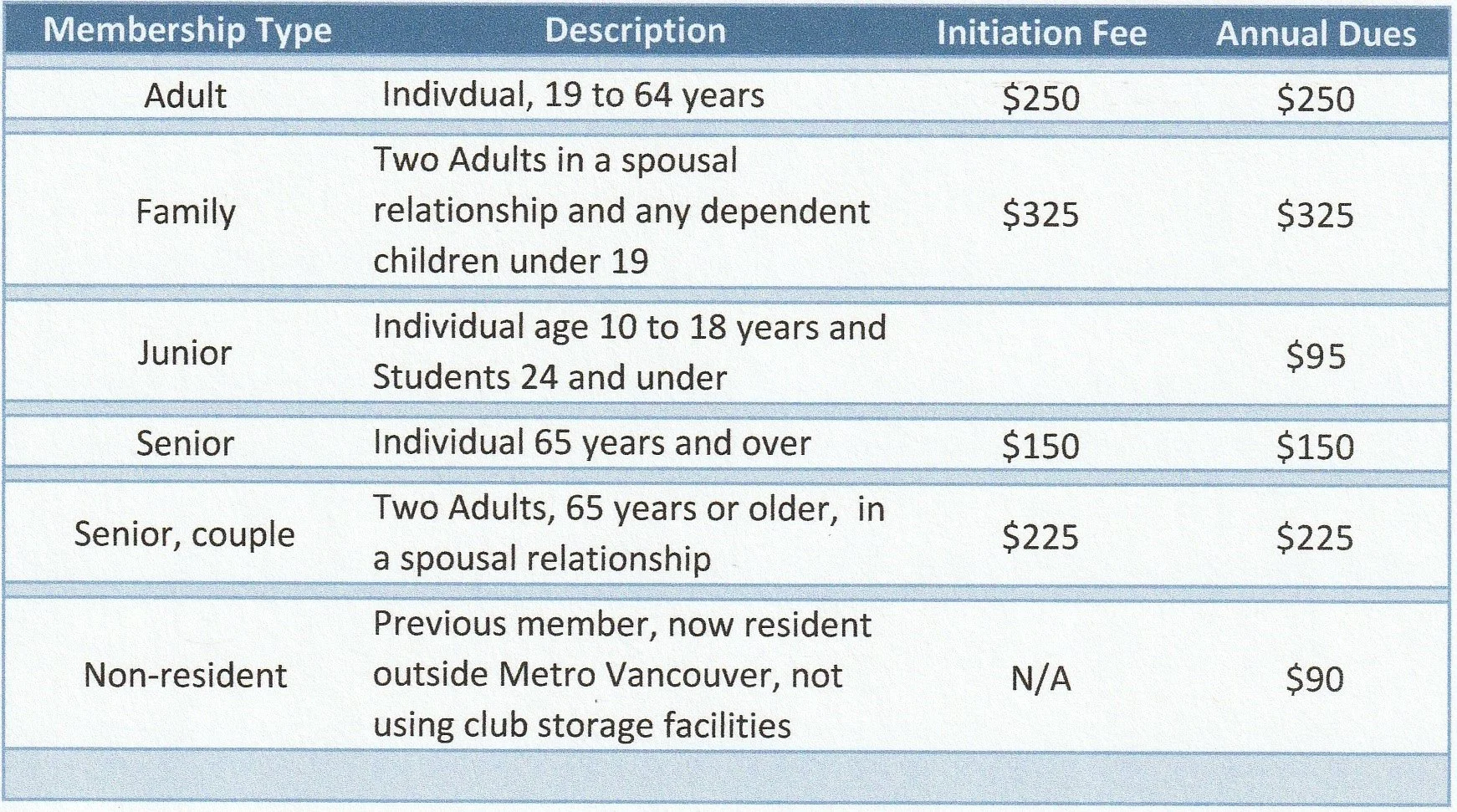Initiation fees are a one time only fee for new members. New members pay this in addition to annual dues. All fees are non-refundable. 5% GST is included where applicable. Fees are for January 1 through December 31 of each year and are not prorated. If you sign up in June, you pay the full amount. If you sign up after October 1st, you pay the current year's fees, but get the following year included.