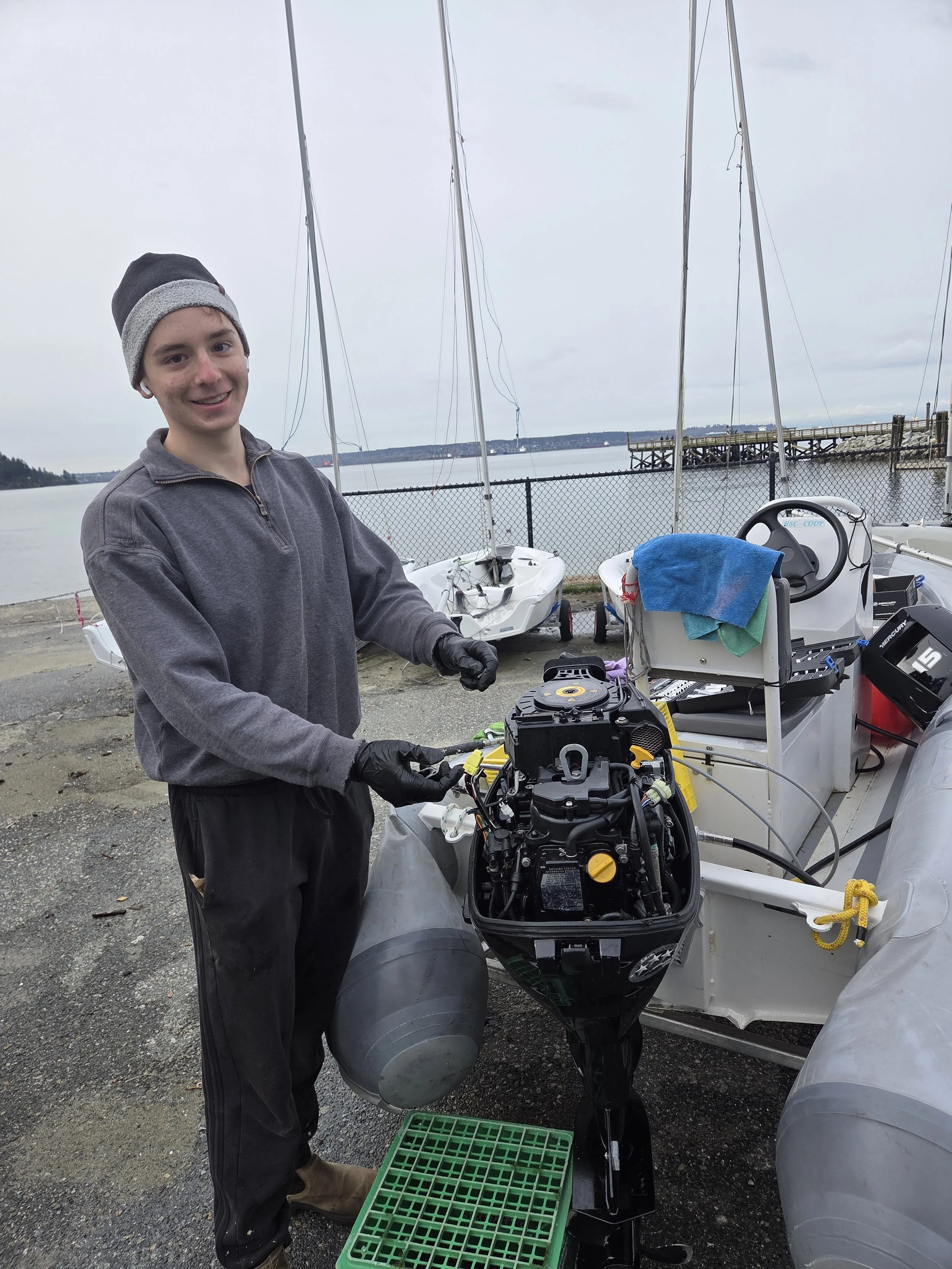 Zach, our Hydrographer, services a Coach Boat for the upcoming Sailing School Season. He has bought “servicing kits” for the ooutboards and by doing the work himself, Zach is saving the clubmoney that will now go to our training program and pay for coach’s salaries. Thanks Zach!