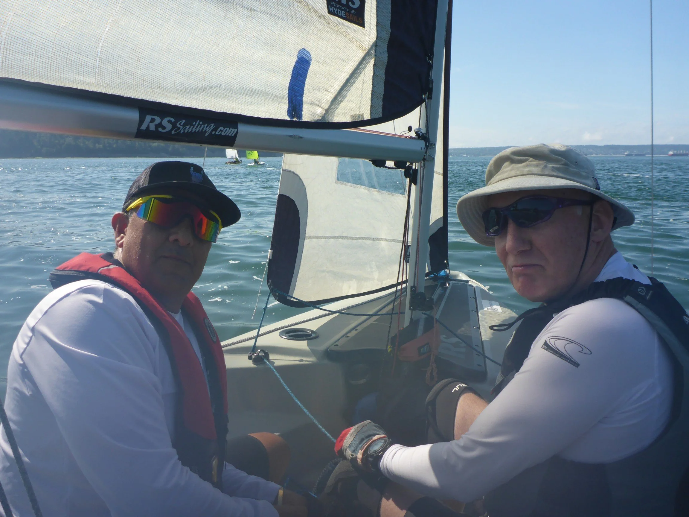 We got lucky and had some very good sailing conditions today. We had 18 people in 8 boats, plus Tom (and Braxton zipping about in his Waszp). We used 5 of the 6 co-op boats.
