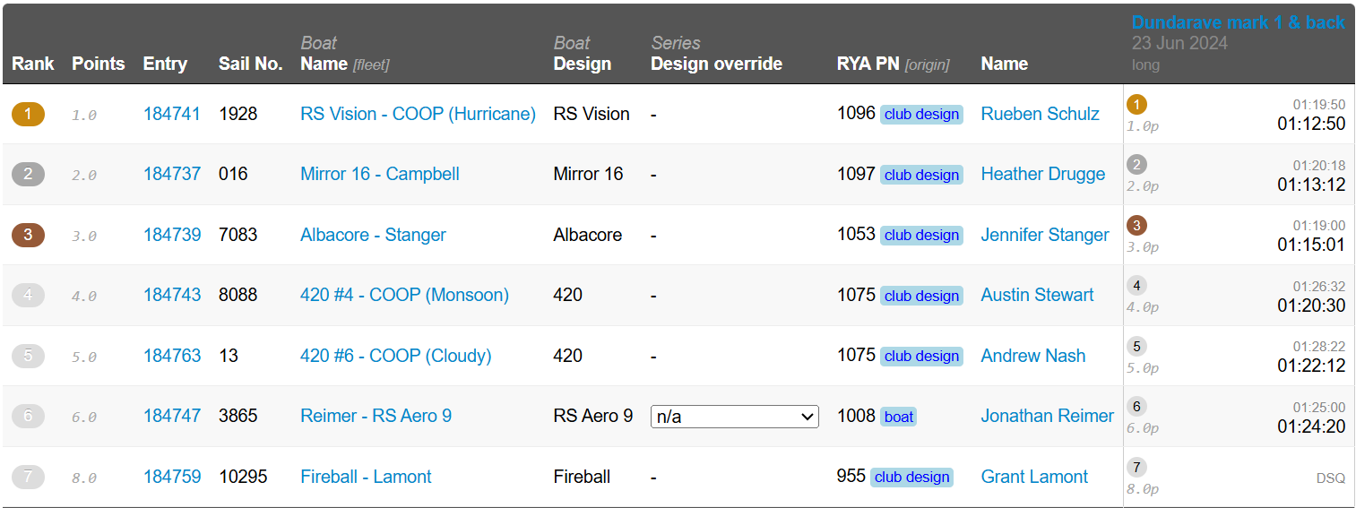 Race calculation: Elapsed Time in Seconds / PY x 1000 = Corrected Time in Seconds